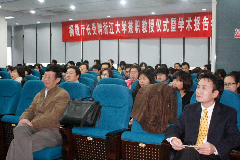 2010年12月13日下午15:00时,浙江大学医学部举办了“浙江省卫生厅厅长杨敬兼职教授受聘仪式暨学术报告会”。会议由公共卫生系副主任(主持工作)朱善宽教授主持,浙江大学党委副书记任少波教授、医学部主任段树民院士分别代表学校和医学部向杨敬厅长颁发了聘书并佩戴了校徽。