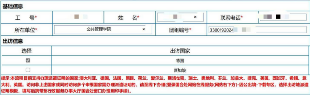 登录“浙大服务”-Z2028:教职工因公临时出国派遣证明”流程,输入出访人个人信息及团组编号,勾选需办理派遣证明的国家名称。